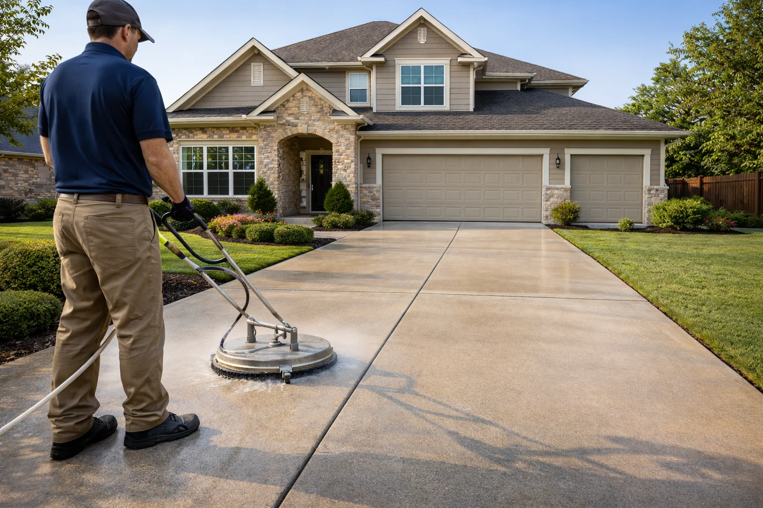Our crew arrives with commercial-grade equipment — not rental store machines. We confirm scope, protect your landscaping and property, then get to work.